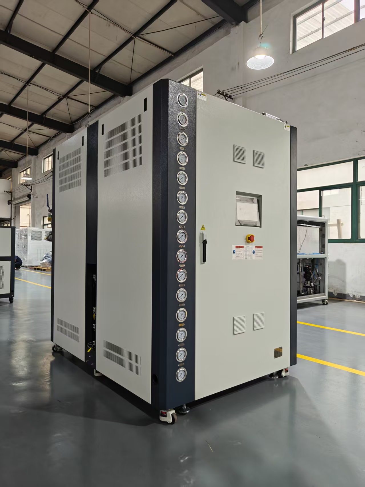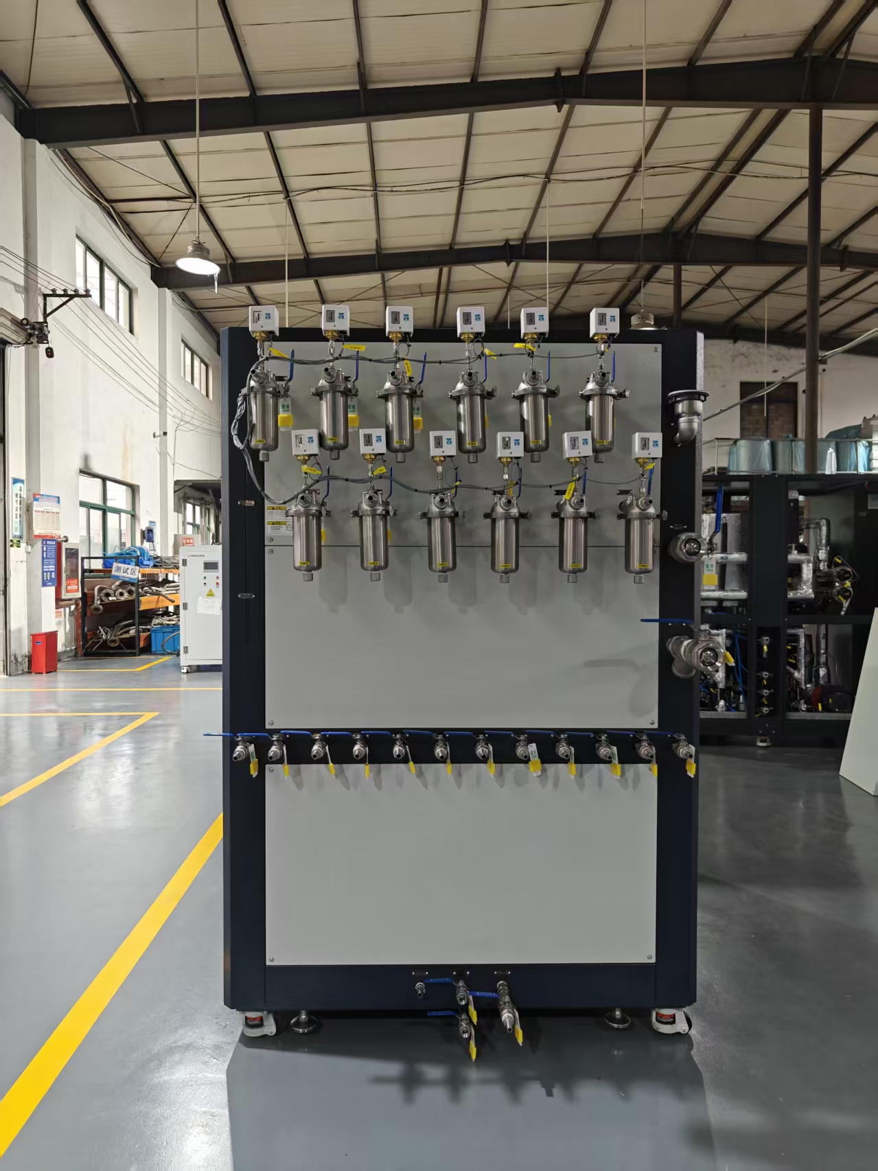 十二通道水冷系统是一种具备**12组独立散热流道**的闭式循环水冷设备,核心作用是为多分散热源(如多芯片、多模组设备)提供同步、精准的散热,本质是“单冷水机+多分支流道”的集成方案。### 一、核心特点1. **多通道独立可控**:12个流道可单独调节流量和水温,能适配不同发热功率的热源(如某通道给100W芯片散热,另一通道给500W模组散热),避免单通道“一刀切”导致的局部过热或能源浪费。2. **散热负荷更高**:相比单/双通道系统,12通道并行处理总散热负荷,单台设备可覆盖数千瓦至数十千瓦需求(如工业多工位设备、高密度服务器集群),无需多台冷水机拼接。3. **控温精度更优**:多数系统配备12组独立温度传感器,实时监控每个通道的进出水温(精度可达±0.5℃),结合PID调节,能稳定控制各热源的工作温度。### 二、基本工作原理1. **冷水制备**:系统内置的压缩机、蒸发器等核心部件,先将载冷剂(通常是去离子水+防冻液)降温至目标温度(如15-25℃)。2. **分路输送**:降温后的载冷剂通过主管道,分流至12个独立分支流道,分别流经对应的待散热设备(如芯片、模组、反应腔)。3. **吸热回流**:载冷剂在各通道吸收热量后,汇总至回水管路,重新进入蒸发器降温,形成闭式循环。### 三、典型适用场景- **工业设备**:多模组工控机、多工位激光设备、像你之前涉及的“多工位镁合金小件冷却”等,可同时为12个工位提供针对性散热。- **电子设备**:高密度服务器集群(12个节点分别散热)、多GPU算力工作站,避免传统风冷的噪音和散热瓶颈。- **实验室场景**:多样品恒温实验台、12组并行反应装置的控温,需精准控制每个样品的环境温度。### 四、关键注意事项- 需定期维护:12个流道的滤网、管道易因水质问题结垢或堵塞,需按周期清洗(建议每3-6个月一次),避免流量下降导致散热失效。- 通道需匹配热源:每个通道的设计流量(如1-5L/min)需与对应热源的发热功率匹配,选型时需先统计12个热源的单功率和总功率。要不要我帮你整理一份**十二通道水冷系统选型参数表**?包含“单通道流量范围、总散热负荷、控温精度、适配热源类型”等关键指标,方便你结合具体设备需求快速筛选型号。